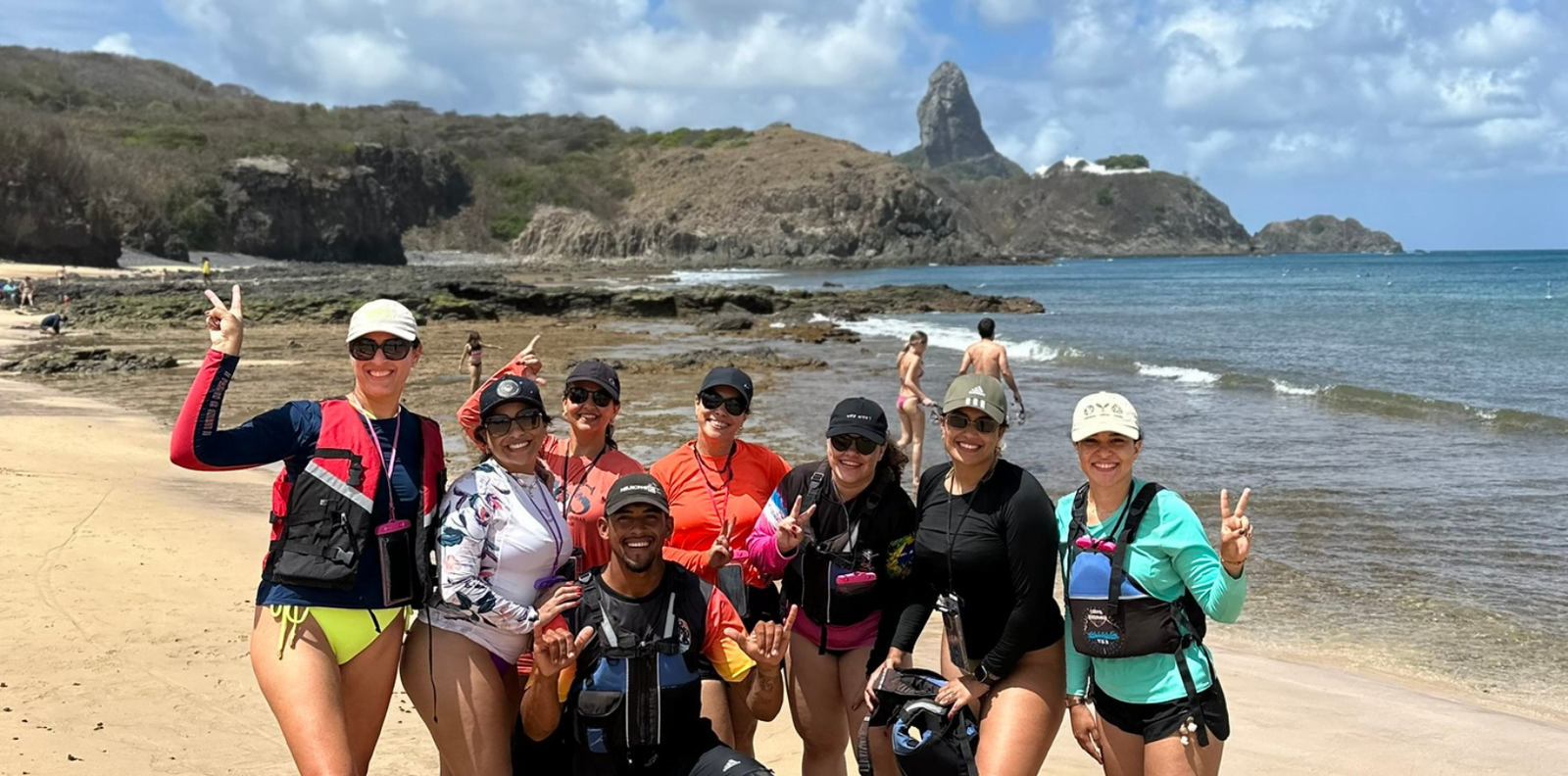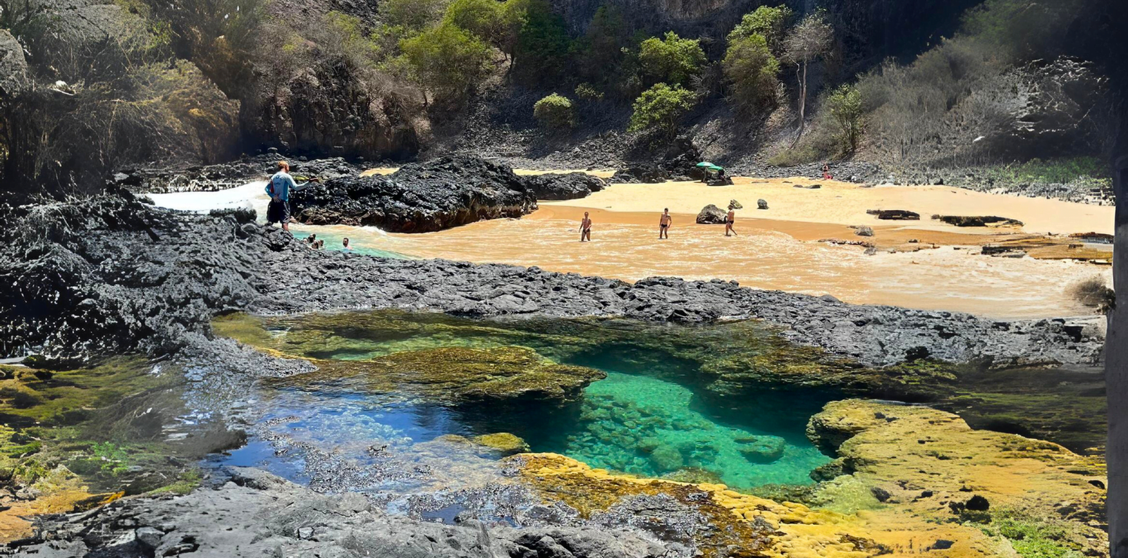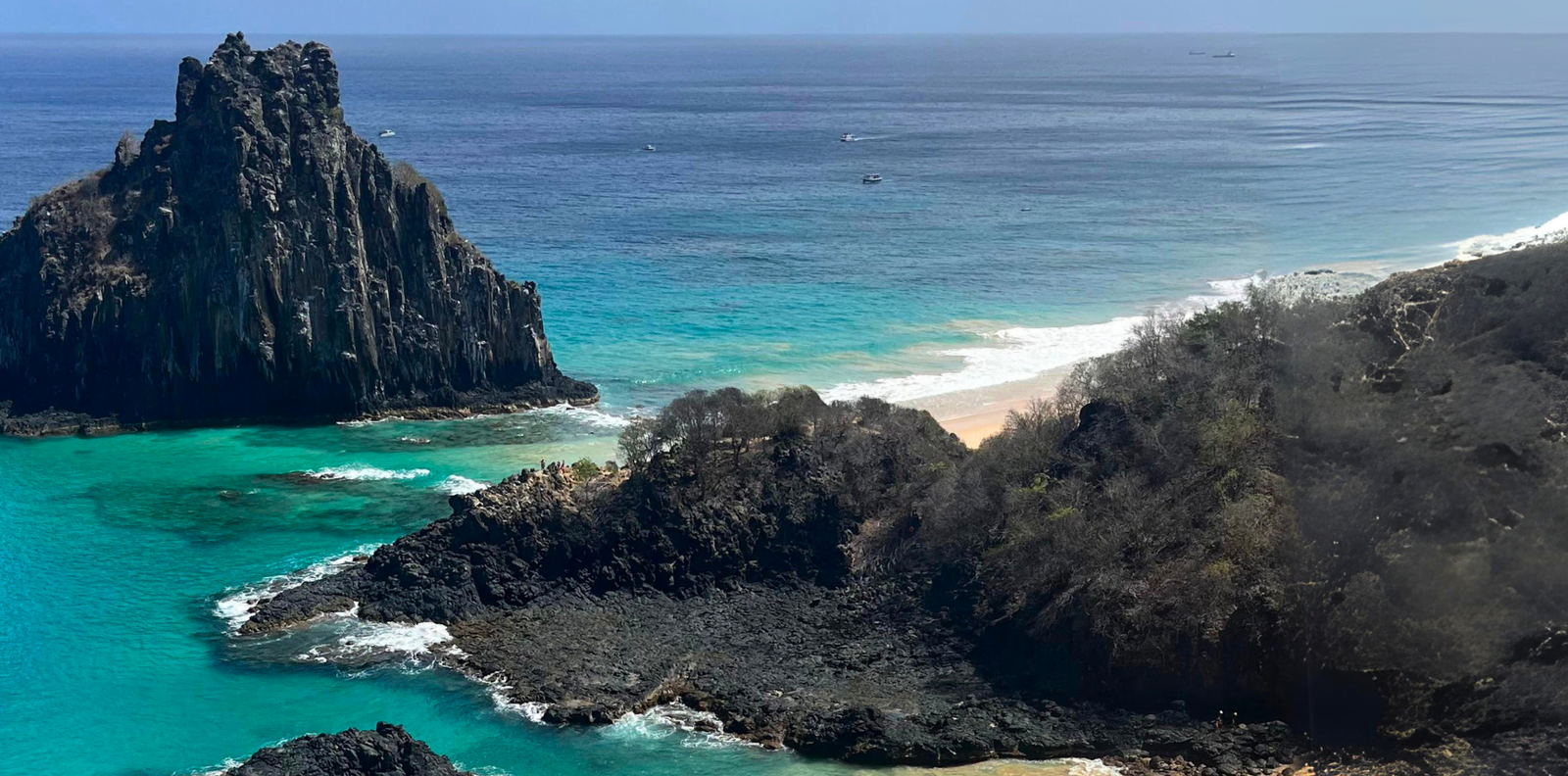 Depois do almoço, fomos para a segunda parte do dia, onde conhecemos a Praia do Sancho (eleita 6x a mais bonita do Brasil) e Cacimba do Padre, que é incrivelmente linda e a queridinha dos surfistas, com ondas de até 7m. Dessa praia, temos uma vista privilegiada do Morro Dois Irmãos. Caminhando no sentido esquerdo da praia, fica o acesso à Baía dos Porcos.