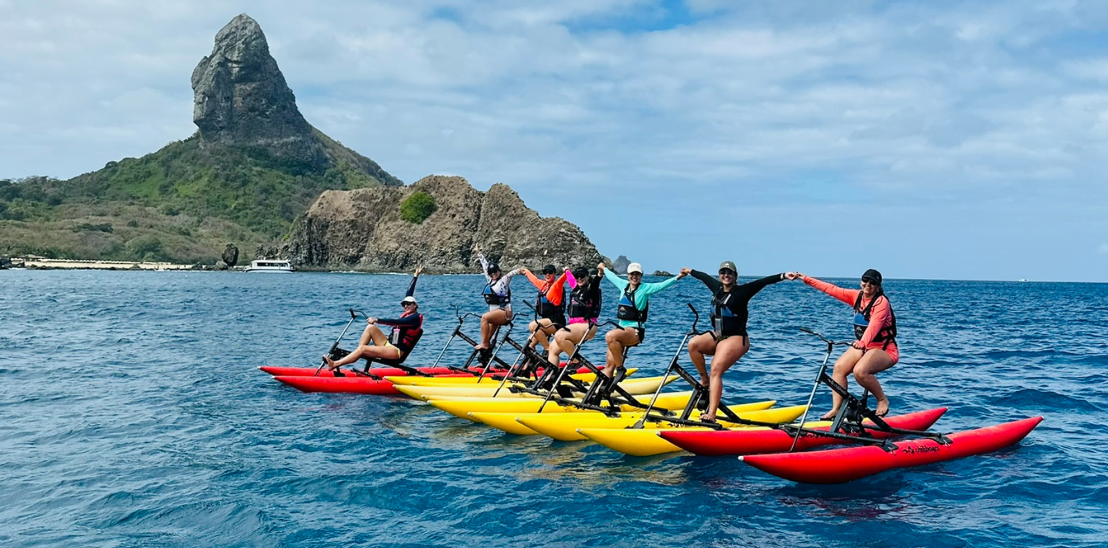O MELHOR dia da minha experiência em Noronha! Começamos com um passeio incrível de bike aquática, saindo da Praia do Porto. A experiência foi impecável, nosso guia – conhecido como Amendoim -, é um cara super alto astral. Nos trouxe muita informação e história sobre a ilha e a vida marinha durante o rolê, além de tirar as melhores fotos e registrar momentos lindos. Eu me emocionei demais durante o passeio, fiquei maravilhada com a beleza da ilha vista desse ângulo, e os golfinhos deram um show! Foi lindo e jamais vou me esquecer! Nunca vi tanto golfinho junto assim, era um grupo imenso, cerca de 500, todos nadando à nossa volta!